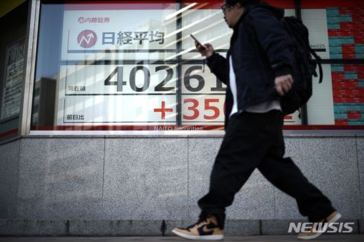 [도쿄=AP/뉴시스]일본 도쿄증시에서 4일 닛케이평균주가(닛케이지수)는 장중, 종가 기준 모두 4만선을 돌파하며 사상 최고치를 경신했다. 사진은 이날 닛케이지수를 보여주는 도쿄의 한 증권사 전광판 앞을 시민이 지나가고 있는 모습. 2024.03.04. |