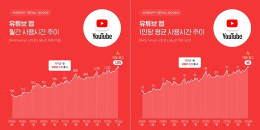 유튜브 앱 사용시간은 올해 1월 1119억 분으로 지난 5년 동안 116% 증가했다. 또 유튜브 앱 1인당 평균 사용시간도 지난 2019년 21시간보다 90% 증가한 40시간을 돌파하며 역대 최대를 기록했다.