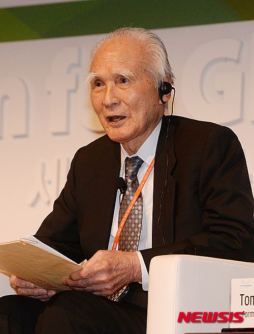 [서울=뉴시스] 장세영 기자 = 일본 식민지 지배에 대한 "통절한 반성", "진심으로 사죄" 등이 명기된 '무라야마 담화'의 무라야마 도미이치(村山富市) 전 총리가 100세 생일을 맞이해 일본의 평화를 기원했다. 사진은 무라야마 전 총리가 2015년 10월 29일 오전 서울 중구 신라호텔에서 열린 2015 세계평화회의에 참석해 발언을 하고 있는 모습. 2015.10.29.photothink@newsis.com |