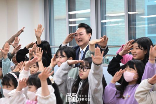 윤석열 대통령이 지난 2월 5일 경기도 하남 신우초등학교에서 '따뜻한 돌봄과 교육이 있는 늘봄학교' 주제로 열린 아홉 번째 국민과 함께하는 민생토론회에 앞서 늘봄학교 방송댄스 프로그램을 참관하며 학생들과 댄스동작을 함께하고 있다. [사진=대통령실] |