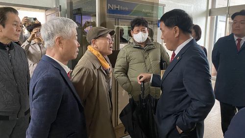 (김해=연합뉴스) 최병길 기자 = 국민의힘(이하 국힘)이 총선에서 낙동강벨트 격전지이자 당이 분석한 '험지'인 경남 김해을 선거구에 3선 조해진(경남 밀양·창녕·함안·의령) 의원을 전략공천해 지역 내 갈등을 빚는 가운데 5일 국힘 김해을 시도의원들이 조 후보에 대한 지지선언을 하려다 당원들의 저지로 무산됐다.