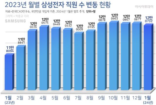 국민연금 가입자를 기준으로 한 삼성전자 직원 수는 지난해 1월 11만8094명에서 올해 1월 12만732명으로 약 2.2%(2638명) 늘었다.