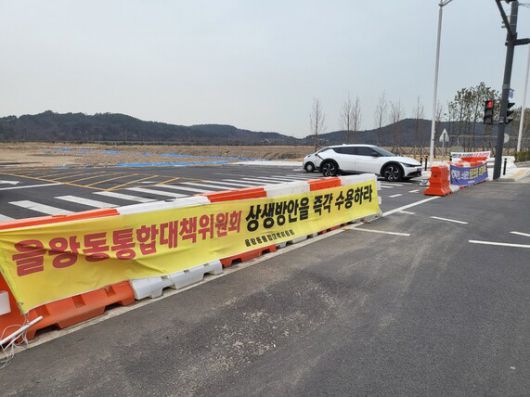 인스파이어 리조트 정문 건너편에 걸린 주변 상인들의 걸개막. 이승욱 기자 |