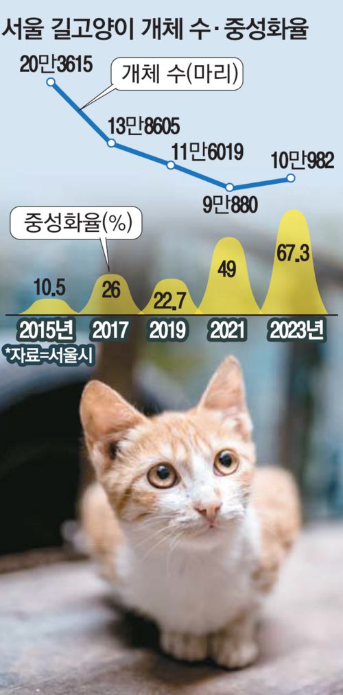 중성화 사업 결과 길고양이 숫자는 확연하게 감소했다. 서울시에 따르면 최근 9년새 길고양이 개체수 추정치는 절반 가까이 줄었다. 2015년 20만 3615마리였는데 2017년 13만 8605마리, 2019년 11만 6019마리, 2021년 9만 880마리, 2023년 10만982마리로 조사됐다. 이미경 서울시 동물보호과장은 “모든 고양이를 조사하는 건 불가능해 일부 지역을 조사한 후 추정치를 낸 것”이라며 “개체수보다는 중성화율과 자묘(새끼 고양이)율 변화가 감소추세를 더 확실하게 보여주는 지표”라고 말했다.