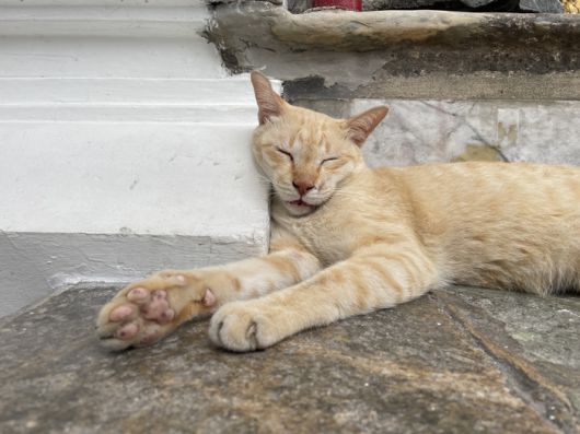 고양이 한 마리가 벽을 베개삼아 낮잠을 자고 있다. [한주형 기자] |