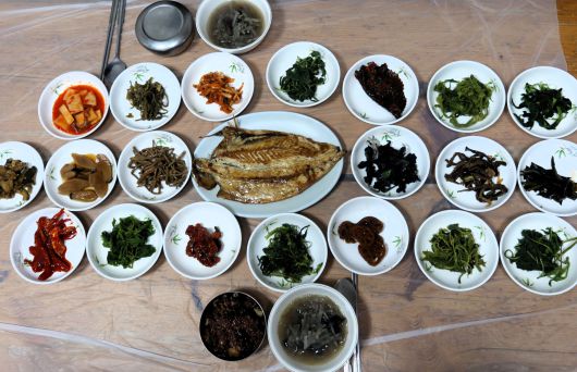 산골에서 살았던지라 나물이라면 이것저것 많이 먹었지만, 안주인이 내놓은 상차림을 보고 기가 죽었다. 저 나물을 다 먹을 수 있을까 하는 걱정까지 했다. 취나물, 명이나물, 나물취, 뽕잎, 다래 순, 가지, 참두릅, 까마귀 버섯, 깻잎, 개두릅, 갯방풍, 무나물, 더덕, 고사리, 고구마 줄기, 새송이버섯 등 열댓 가지다. 여기에 능이버섯을 넣은 무국과 오곡밥을 내놓았다. 반주는 옥수수 막걸리다. 늘 주문진이나 사천진에서 생선구이나 탕이나 회나 조림을 찾았기에 강릉에 산나물이 많이 난다는 것을 깜박했다. 산채정식에 올라 온 바다 음식은 고등어구이와 서거리젓과 낙지젓이 전부다. 사실 이것만으로도 밥 한 그릇 비우는 데 부족함이 없다.