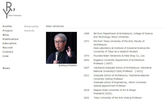 일본 건축가 야마모토 리켄의 공식 누리집 프로필 갈무리 (출처 : RY 누리집) 2024.03.06/