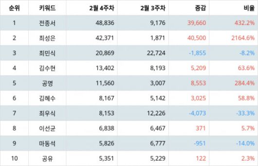 최성은은 42,371포인트로 전주보다 40,500포인트 상승해 2위를 차지했다.