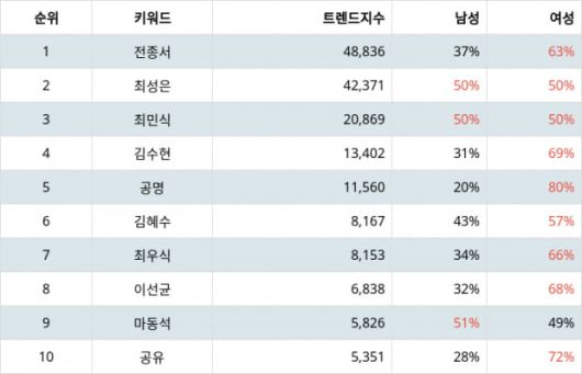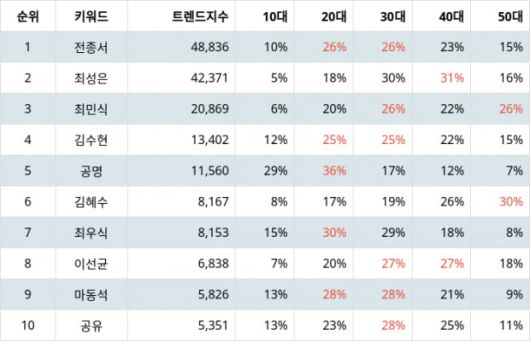 연령별 선호도에서는 전종서가 10대 10%, 20대 26%, 30대 26%, 40대 23%, 50대 15%로 나타났다.