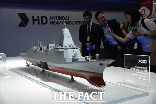 총 8조원 규모 한국형 차세대 구축함(KDDX) 사업 관련 기밀 유출 혐의로 직원 유죄가 확정된 HD현대중공업의 임원을 수사해 달라는 한화오션의 고발장을 접수한 경찰이 수사에 나섰다. HD현대중공업이 공개한 KDDX 모형. /김태환 기자 |