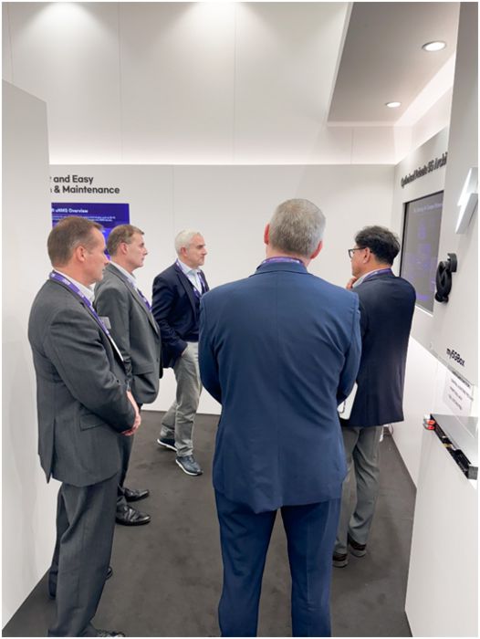 글로벌 기업 임직원이 스페인 바르셀로나 MWC24에 마련된 에치에프알 부스에 방문해 이음5G솔루션 시연을 보고 있는 모습 |