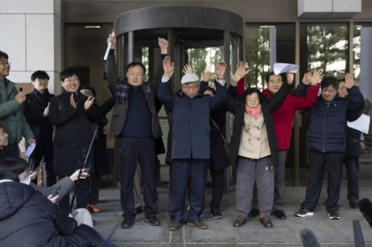 강제동원 피해자 유가족 - 일제 강제동원 피해자 유가족 등이 지난해 12월 28일 서울 서초구 대법원에서 열린 미쓰비시중공업, 히타치조센 등을 상대로 낸 손해배상 청구 소송의 상고심 선고가 마친 후 기뻐하고 있는 모습. 대법원은 피해자가 일부 승소한 원심판결을 확정했다. 연합뉴스 |
