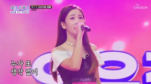 '미스트롯3'을 통해 새로운 도전에 나선 오유진은 자신의 이름값을 제대로 입증했다. 첫 라운드에서는 탄탄한 보이스로 마스터 군단을 한 번에 사로잡았고 2라운드 팀 대결에서는 10대 참가자임에도 리더를 맡으며 팀을 이끄는 중심으로 리더십을 발휘했다. 3라운드 대결에서는 또 다른 우승 후보 배아현과의 대결에서 승리를 거뒀고 이어진 라운드에서도 "스타성만큼은 단연 1위"라는 대선배들의 극찬을 받았다.