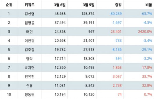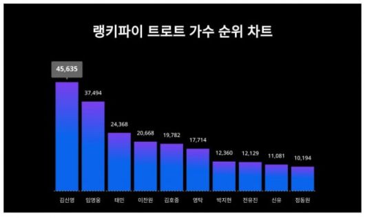 임영웅은 37,494포인트로 전일보다 1,697포인트 하락해 2위를 차지했다. 태민, 이찬원, 김호중, 영탁, 박지현, 전유진, 신유, 정동원이 뒤를 이으며 3~10위를 기록했다.
