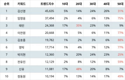 트렌드 지수 1위 김신영의 빅데이터 조사한 결과, 김신영 지호, 김신영 노래, 김신영 시소, 김신영 운동, 김신영 식단 등이 주목받는 관련 검색어로 나타났으며 2위 임영웅은 임영웅 콘서트, 임영웅 노래, 임영웅 갤러리, 임영웅 콘서트 티켓, 임영웅 엄마, 3위 태민은 태민 노래, 태민 트로트 등으로 나타났다.