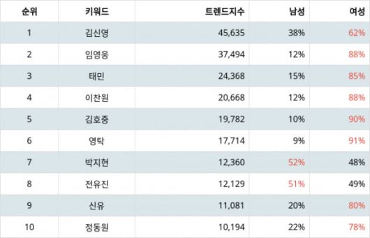 성별 선호도 분석 결과 1위 김신영은 남성 38%, 여성 62%, 2위 임영웅은 남성 12%, 여성 88%, 3위 태민은 남성 15%, 여성 85%가 선호하는 것으로 나타났다.