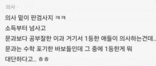 글쓴이 A씨는 “의사 밑이 판·검사지. 소득부터 넘사(넘을 수 없는 사벽)다”라면서 “문과보다 공부를 잘한 이과, 거기서 1등 한 애들이 의사 하는 것”이라고 말했다.