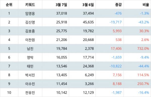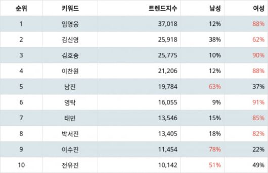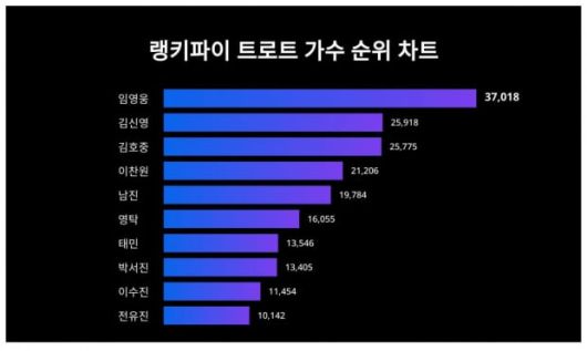 랭키파이에 따르면 임영웅은 트렌드 지수 37,018포인트로 전일보다 476포인트 하락해 1위에 올랐다.