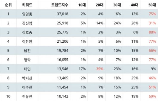 연령별 선호도에서는 임영웅이 10대 2%, 20대 4%, 30대 6%, 40대 13%, 50대 75%로 나타났다.