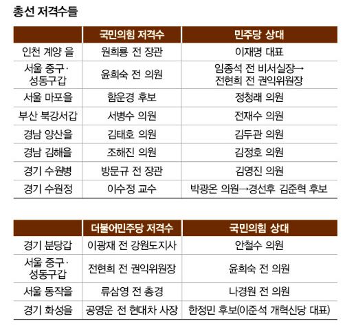 지난 총선에서 나경원 전 의원의 발을 묶기 위해 이수진 전 판사를 전략공천했던 민주당은 이번에는 이 지역구에 류삼영 전 총경을 전략공천했다. 경찰국 신설을 반대하며 전국 경찰서장회의를 이끈 류 전 총경을 나 의원의 저격수로 삼은 것이다. 민주당의 돋보이는 저격수로는 공영운 후보(경기 화성을)를 손꼽을 수 있다. 현대자동차 사장 출신인 공 후보는 반도체 연구원 출신인 한정민 국민의힘 후보, 이준석 개혁신당 대표와 뜨거운 3파전을 벌이게 됐다. 김상일 정치평론가는 “저격수 출마는 당에서 어떤 스토리를 짜서 내세우고, 그 스토리를 밑바탕으로 후보가 자기 PR을 해야 의미가 있다”고 말했다.