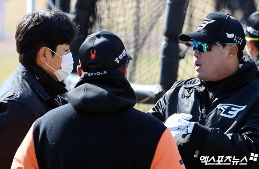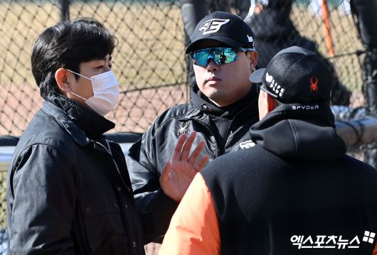 (엑스포츠뉴스 대전, 김한준 기자) 류현진이 삼성 강민호 및 코칭스태프와 반가운 인사를 나눴다.