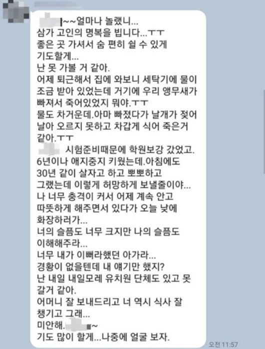 A씨가 공개한 메시지에는 친구 B씨의 사정이 구구절절 담겨 있다. 메시지 내용을 보면 “얼마나 놀랐니. 삼가 고인의 명복을 빕니다. 좋은 곳 가셔서 숨 편히 쉴 수 있게 기도할게. 난 못 가볼 거 같아. 어제 퇴근해서 집에 와보니 세탁기에 물이 조금 받아져 있었는데 거기에 우리 앵무새가 빠져서 죽어있었지 뭐야. 물도 차가운데. 아마 빠졌다가 날개가 젖어 날아오르지 못하고 차갑게 식어 죽은 거 같아”라고 적혔있었다.