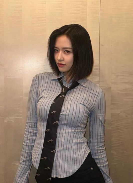 공개된 사진에는 몸에 피트되는 셔츠에 넥타이를 매고 프레피룩을 선보이고 있다. 셔츠에도 드러나는 볼륨 몸매가 눈길을 끈다.