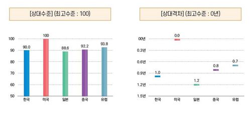 5개 지역 중 한국의 순위는 전년에 이어 4위였다. 유럽이 93.8%로 2위, 중국이 92.2%로 3위였고 일본은 88.6%로 한국보다 낮았다. 미국과의 기술 격차는 유럽 0.7년, 중국 0.8년, 일본 1.2년으로 각각 집계됐다.