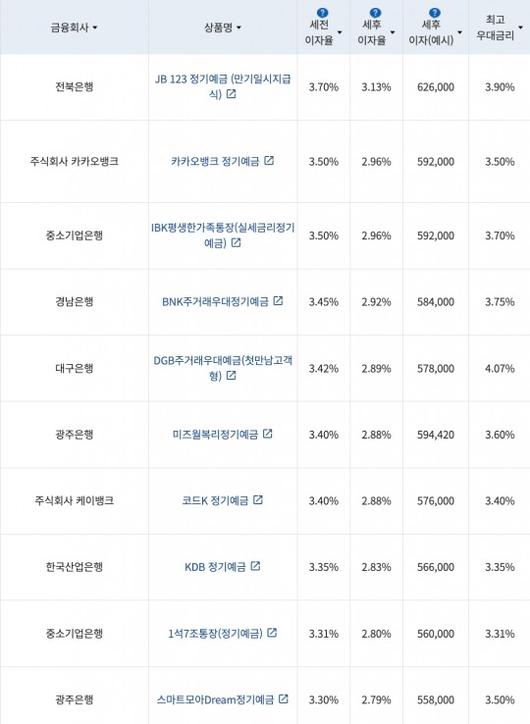 이어 농협은행 ‘NH올원e예금’(3.23%), 대구은행 ‘IM스마트예금’(3.20%), 농협은행 ‘NH내가그린(Green)초록세상예금’(3.15%), 제주은행 ‘제주드림(Dream) 정기예금(개인/만기 지급식)’(3.15%), 경남은행 ‘BNK더조은정기예금’(3.05%) 순으로 금리가 높았다.