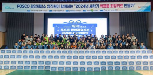 광양제철소(소장 이동렬)가 지난 7일 광양시 포스코 어울림체육관에서 지역 아이들을 위한 '새학기 학용품 희망키트'를 제작·전달하며 따뜻한 나눔문화 확산에 앞장섰다.