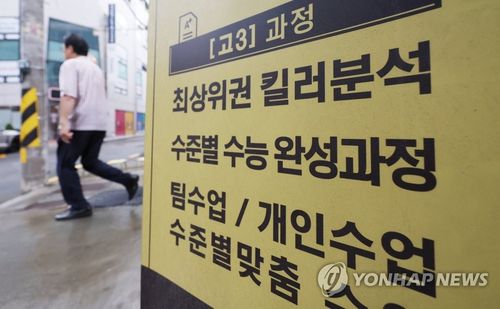 지난해 6월 21일 서울 강남구 대치동의 한 학원 앞에 수업 내용과 관련된 광고문구가 적혀 있다. [연합뉴스 자료사진. 재판매 및 DB 금지] |
