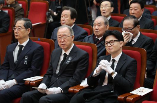 손명순 영결식서 추모사 경청하는 韓 한덕수 국무총리, 반기문 전 유엔사무총장, 한동훈 국민의힘 비대위원장(앞줄 왼쪽부터)이 11일 오전 서울 동작구 국립서울현충원 현충관에서 열린 고 김영삼 전 대통령의 부인 고 손명순 여사의 영결식에서 김현철 김영삼민주센터 이사장의 추모사를 경청하고 있다. 뉴시스 |