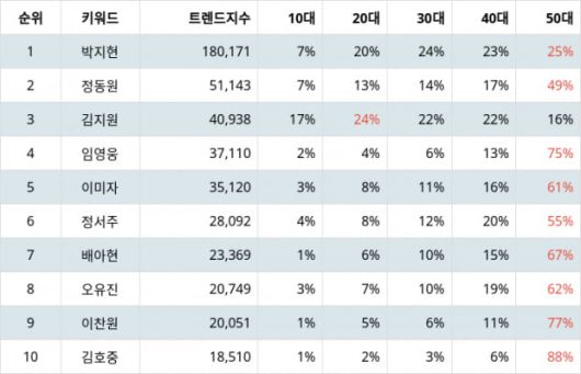 연령별 선호도에서는 박지현이 10대 7%, 20대 20%, 30대 24%, 40대 23%, 50대 25%로 나타났다.