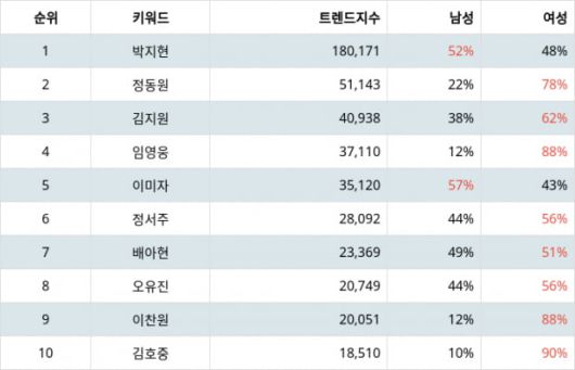 성별 선호도 분석 결과 1위 박지현은 남성 52%, 여성 48%, 2위 정동원은 남성 22%, 여성 78%, 3위 김지원은 남성 38%, 여성 62%가 선호하는 것으로 나타났다.