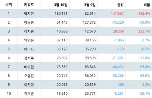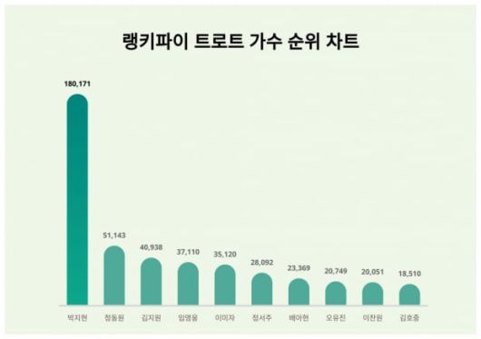 랭키파이에 따르면 박지현은 트렌드 지수 180,171포인트로 전일보다 147,557포인트 상승해 1위에 올랐다.