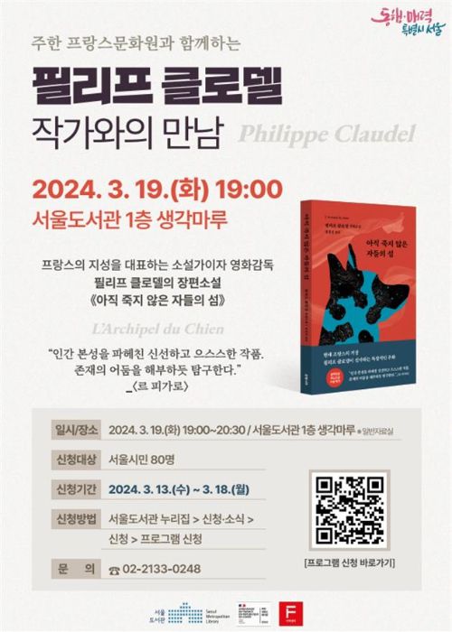 서울도서관은 프랑스의 지성을 대표하는 소설가이자 영화감독인 필리프 클로델(Philippe Claudel)의 열네 번째 장편 소설 '아직 죽지 않은 자들의 섬' 국내 출판을 기념하는 작가와의 만남 행사를 연다.
