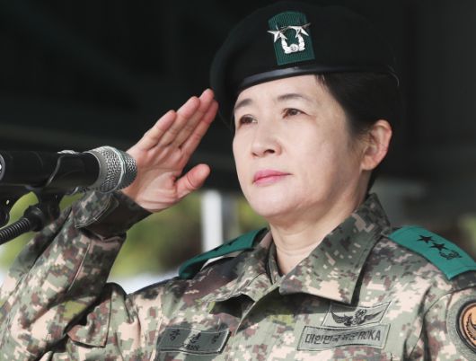 강선영 - 21일 오전 경기도 이천시 육군항공작전사령부에서 열린 ‘제22ㆍ23대 항공작전사령관 이취임식’에서 신임 강선영 사령관이 경례를 하고 있다. 2019.11.21 연합뉴스 |