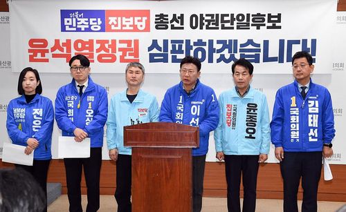 민주당 이선호 울산시당위원장, 진보당 윤한섭 울산시당위원장 등은 이날 울산시의회 프레스센터에서 기자회견을 열어 "4월 총선에서 윤석열 정권의 폭정을 심판하고 정치, 민생, 개혁의 희망을 만들고자 힘을 모았다"고 밝혔다.