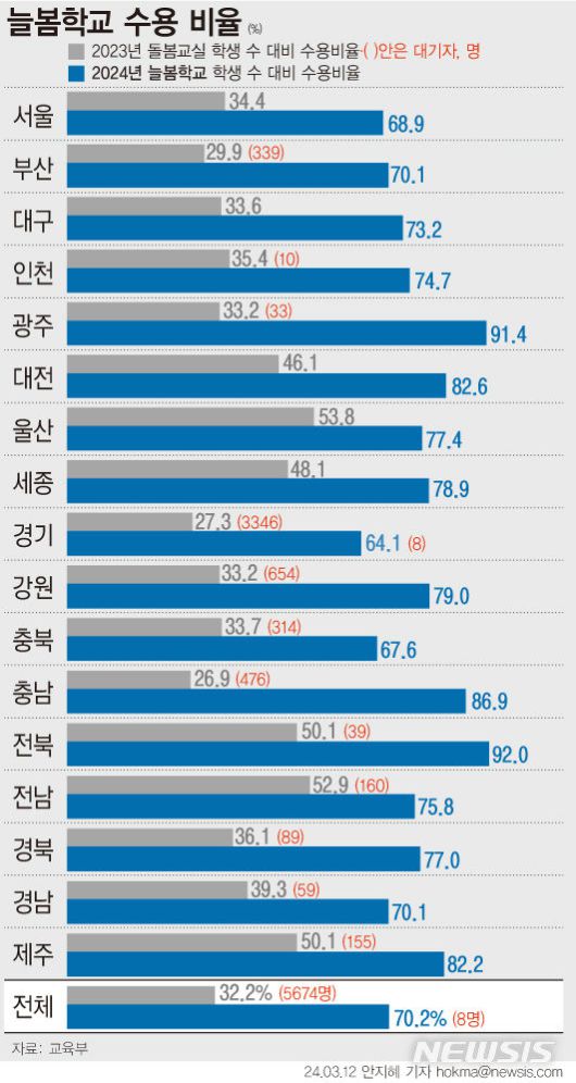 대부분 지역에서 늘봄학교 참여를 희망하면 이용이 가능했다. 대기자 수는 경기 지역 초등 1학년 8명이 유일했다. 지난해 3월엔 경기 3346명 등 학생 5674명이 희망에도 불구하고 돌봄교실을 이용하지 못했다.