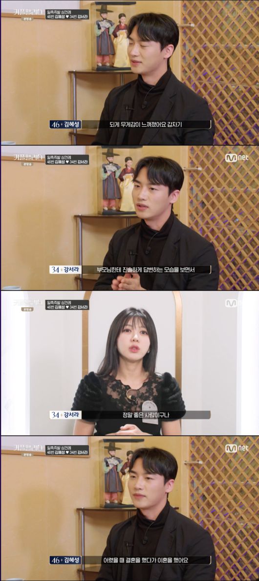 강서라는 “예상치 못한 질문이 나왔을 때 부모님한테 진솔하게 답변하는 모습을 보면서 정말 좋은 사람이구나(를 느꼈다)”라고 밝혀 눈길을 끌었다. 김혜성은 이혼에 대해 언급을 했고, 강서라는 “가족이 없었으니까 어린 나이에 더 깊이 알아보고 결혼을 하기보다는 덜 알아봤을 수 있겠다. 나는 납득이 갔다”라고 말하기도.