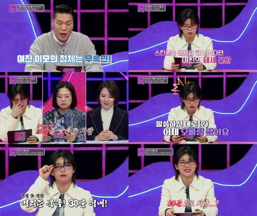첫 만남부터 관상과 사주 얘기를 하던 여자친구는 자신의 무속인 이모를 고민남에게 소개했고, 이모의 조언이라며 고민남이 장례식장에 다녀온 날 비상구에서 소금을 뿌리는가 하면 “이모가 오빠한테 물이 보인대”라며 바람을 의심해 몰래 미행하고 사진까지 찍는 여자친구 때문에 억울함을 호소하자 김숙과 곽정은은 “어릴 때부터 세뇌당한 듯”, “불안감 때문에 이모에게 의지하는 듯”이라는 반응을 보였다.