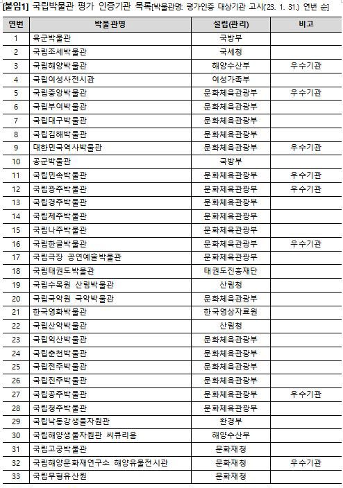 문화체육관광부는 13일 ‘박물관 및 미술관 진흥법’에 따라 등록 후 3년이 지난 국립박물관 49개관과 공립미술관 67개관을 대상으로 종합 평가를 진행한 결과, 기관 운영 등 평가항목에서 일정 점수 이상을 받은 국립박물관 33개관과 공립미술관 40개관을 인증했다고 밝혔다.
