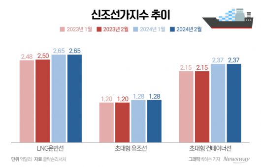 [뉴스웨이 전소연 기자]국내 조선업계 실적을 이끄는 신조선가가 연초부터 우상향하고 있다. 이로써 지난해 분기별 흑자 전환에 성공한 조선 3사는 올해도 모두 흑자 기조를 유지할 전망이다.