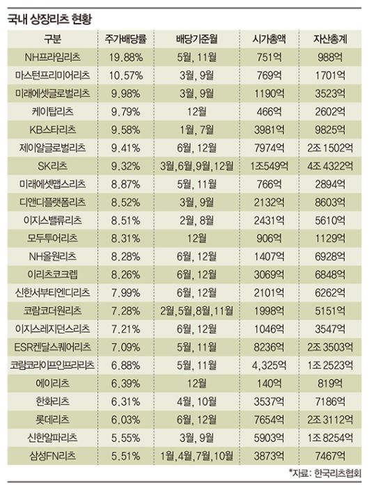 한국리츠협회에 따르면 2022년 국내 상장 리츠의 배당수익률은 연 7.8%를 기록한 것으로 나타났다. 특히 마스턴프리미어리츠(10.66%), 미래에셋글로벌리츠(10.37%), 미래에셋맵스리츠(10.15%), 모두투어리츠(13.97%), 케이탑리츠(11.19%) 등 현재 국내 상장 리츠 23개 중 5개는 10%가 넘는 배당률을 보이기도 했다.