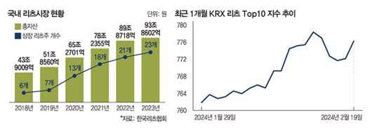그러나 2022년부터 급격한 금리 인상과 부동산 프로젝트파이낸싱(PF) 부실 우려, 해외 부동산 손실 등 악재가 이어지면서 리츠주는 내리막길을 걸었다. 리츠는 자금 재조달(리파이낸싱)을 위해 대규모 자금을 조달해야 하는데 금리가 오르면 이자 비용이 늘어나 수익성 감소 및 배당 매력이 떨어지기 때문이다. 국내 증시에 상장된 리츠주 10개를 모아놓은 ‘KRX리츠TOP10지수’는 지난해 초 900선을 넘기도 했지만 2월 19일 기준 775까지 떨어진 상태다.