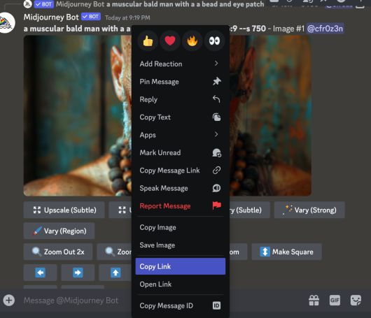 예를 들어 '수염과 눈 패치를 갖춘 근육질의 대머리 남자'라는 프롬프트를 사용해 캐릭터를 생성한 다음, 이미지를 우클릭 한 뒤 메뉴에서 '링크 복사하기(Copy Link)'를 선택한다.