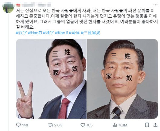 중국 누리꾼은 또 12일 “저는 진심으로 모든 한국 사람들에게 사과, 저는 한국 사람들의 패션 문화를 이해하고 존중한다. 이제 얼굴에 한자 새기는 게 멋지고 유행에 맞는 행동을 이해하게 됐다. 그래서 그들의 얼굴에 멋진 한자를 새겼다. 여러분이 좋아하길 바란다”는 글을 한글로 올리며 윤 대통령과 박 전 대통령 얼굴에 한자를 새긴 사진을 게재했다.