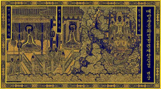 미국 예일대 도서관에서 전시 중인 ‘화엄경 권제31 변상도’. 사경 전시를 열고 있는 김경호 사경장은 “‘영적인 수행’이라고 불리는 사경은 종교를 가리지 않고 수행할 수 있는 좋은 방법”이라고 말했다. 김경호 사경장 제공 |