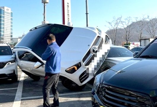A씨가 공개한 사진을 보면 주차된 택시와 카니발 차량 사이에 벤츠가 대각선으로 걸려 있는 것이 보인다. 왼쪽 바퀴는 택시 상부에 닿을 정도로 완전히 들려 있고, 오른쪽 차체 부분은 카니발 차량과 닿아있다. 다른 사진에는 해당 광경을 한 남성이 신기하다는 듯 쳐다보는 장면도 있다.