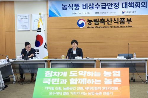 송미령 농림축산식품부 장관은 14일 정부세종청사에서 '농식품 비상수급안정 대책회의'를 열고 한국농수산식품유통공사(aT), 한국식품산업협회, 대형마트 3사 등에 "농식품 물가 안정을 통한 지속 가능한 생산과 소비를 위해 모든 경제주체가 힘을 모아달라"고 말했다.